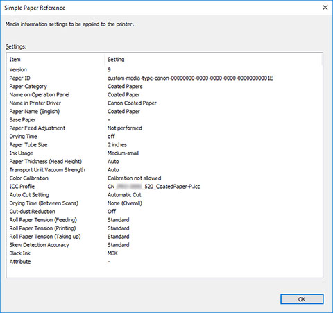 • As informações exibidas na caixa de diálogo Referência de papel comum (Simple Paper Reference) são informações de mídia enviadas pela Media Configuration Tool. Após atualizar as informações de mídia por meio da Media Configuration Tool, observe o painel de controle da impressora para verificar os valores das informações de mídia que foram alterados no painel de controle da impressora.
