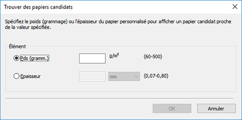 Dans Catégorie de papier, sélectionnez une option autre que Tous, puis cliquez sur le bouton Trouver du papier. Dans la boîte de dialogue Trouver du papier, définissez le paramètre Pds (gramm.) ou Epaisseur, puis cliquez sur le bouton OK.