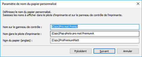 Spécifiez ensuite le nom du papier, puis ajoutez-le sur l'imprimante en tant que papier personnalisé.