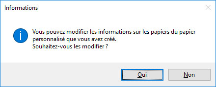 Cliquez sur le bouton Oui pour afficher la boîte de dialogue Modifier le papier personnalisé. Effectuez les opérations à partir de l'étape 3 de la section « Modification d'un papier personnalisé ».