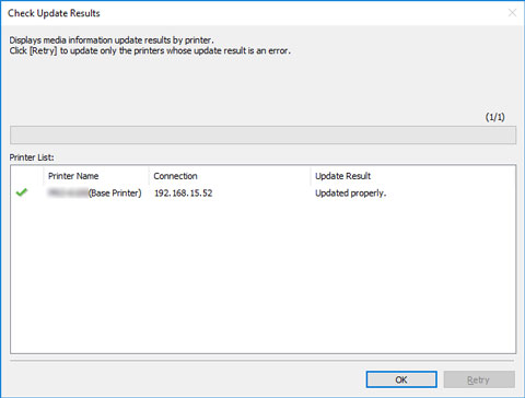 용지 정보가 프린터에 성공적으로 업데이트되면 프린터 드라이버 용지 정보 업데이트(Update Printer Driver Media Information) 화면이 나타납니다.