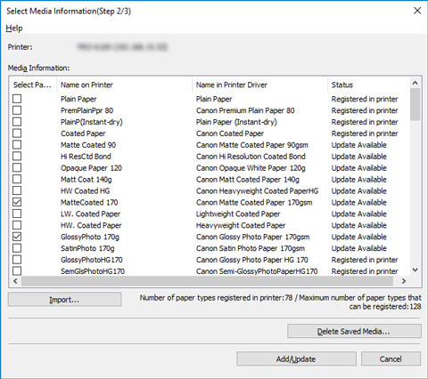 용지 정보 선택(Select Media Information) 화면에서 등록할 용지의 확인란을 선택합니다.