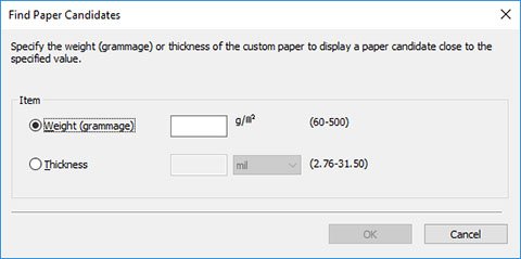 용지 카테고리(Paper Category)에서 모두(All) 이외의 옵션을 선택한 다음 용지 찾기(Find Paper) 버튼을 클릭합니다. 용지 찾기(Find Paper) 대화 상자에서 무게(평량)(Weight (grammage)) 또는 두께(Thickness)를 설정한 다음 확인(OK) 버튼을 클릭합니다.