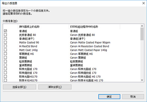 从注册在基准打印机的介质信息中选择所需的纸张,并将其导出到文件,然后保存。