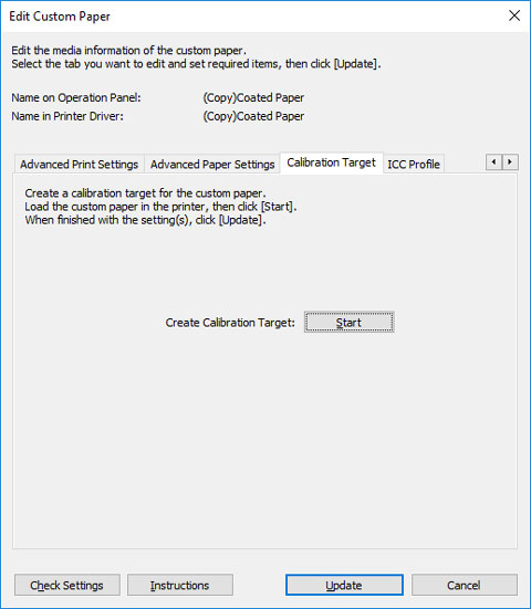 보정 목표(Calibration Target) 및 ICC 프로파일(ICC Profile) 시트를 설정한 후 고급 용지 설정(Advanced Paper Settings) 시트에서 잉크 사용량을 변경하면 보정 목표(Calibration Target) 및 ICC 프로파일(ICC Profile) 시트의 설정이 비활성화됩니다. 이런 경우에는 보정 목표(Calibration Target) 및 ICC 프로파일(ICC Profile) 시트를 다시 설정하십시오.