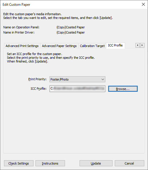 편집하려는 사용자 정의 용지에 적합한 ICC 프로파일이 제공된 경우, 찾아보기(Browse) 버튼을 클릭하고 ICC 프로파일을 선택합니다.