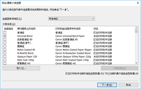 如果在选择国家或地区中选择您的国家或地区,则仅显示您所在国家或地区的可用纸张。