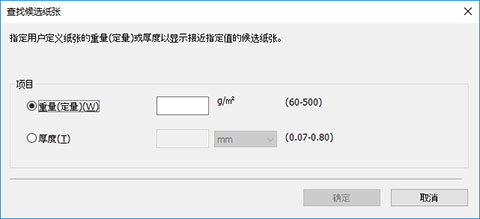 在纸张类别中,选择除全部之外的任何选项,然后单击查找纸张按钮。 在查找纸张对话框中,设置重量(克重)或厚度,然后单击确定按钮。