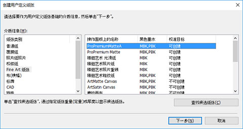 选择将用作用户定义纸张基础的介质信息,然后单击下一步按钮。
