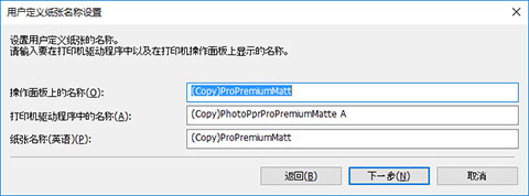 下一步,指定纸张名称,然后将其作为用户定义纸张添加至打印机。