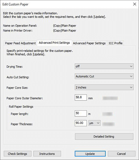 In questo caso, impostare Impostazione taglio automatico (Auto Cut Setting) su Taglio manuale (User Cut) nella scheda Impostazioni stampa avanzate (Advanced Print Settings) della finestra di dialogo Modifica carta personalizzata (Edit Custom Paper).