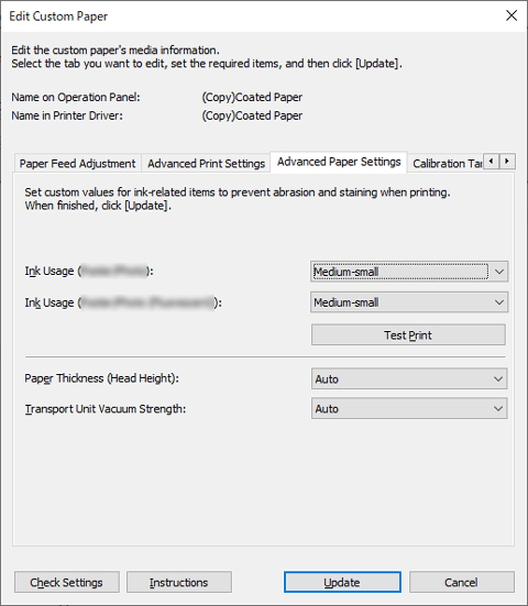 Per i modelli sui quali non è possibile modificare Uso inchiostro (Ink Usage), selezionare un tipo di carta speciale con un utilizzo di inchiostro mirato da Special 1 a Special 10 per Special in Crea carta personalizzata (Create Custom Paper), quindi utilizzarla come supporto di base per aggiungere carta personalizzata.