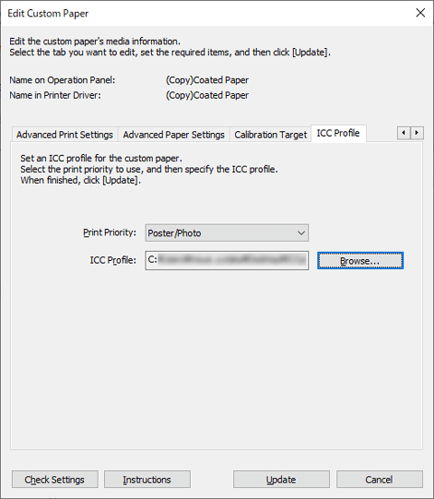 Se è stato fornito un profilo ICC idoneo per la carta personalizzata da modificare, fare clic sul pulsante Sfoglia (Browse) e selezionarlo.