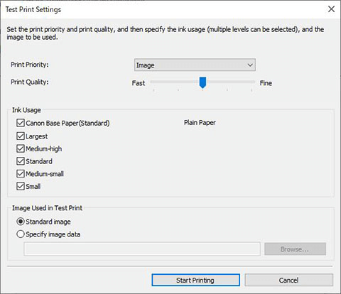 Selezionare il livello di uso dell'inchiostro per la stampa di prova. Carta di base Canon (Canon Base Paper) è l'uso dell'inchiostro per la carta selezionata come base per la carta personalizzata.