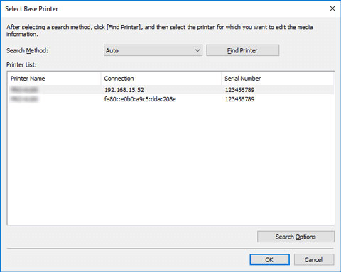Media Configuration Tool에 캐시가 없거나 캐시가 여러 개인 경우 기준 프린터 선택(Select Base Printer) 대화 상자가 나타납니다.