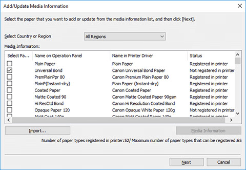 용지 정보 선택(Select Media Information) 화면에서 등록할 용지의 확인란을 선택합니다.