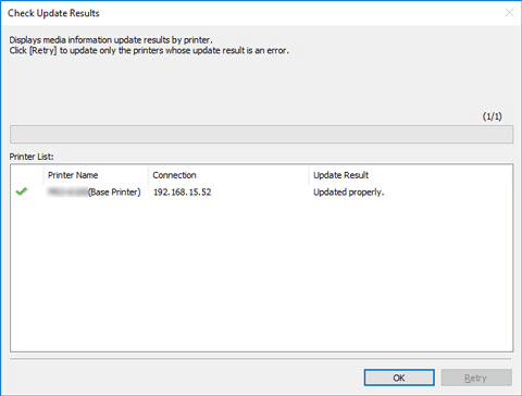 표시가 나타나는 프린터의 경우 용지 정보가 업데이트되지 않았음을 의미합니다.프린터와 네트워크의 상태를 확인하고 다시 시도(Retry) 버튼을 클릭하십시오.