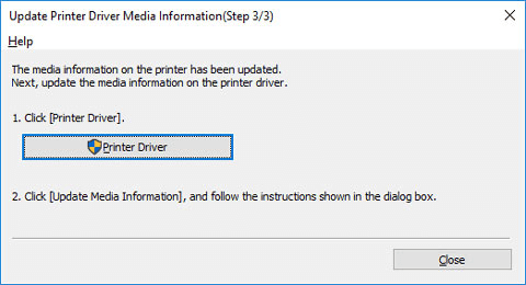 용지 정보가 프린터에 성공적으로 업데이트되면 프린터 드라이버 용지 정보 업데이트(Update Printer Driver Media Information) 화면이 나타납니다.