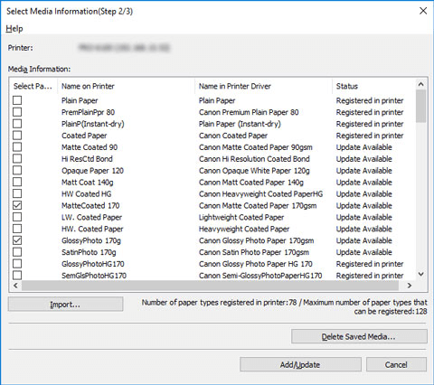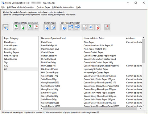 Se o Número máximo de tipos de papel que podem ser registrados (Maximum number of paper types that can be saved) exibido no canto inferior esquerdo da tela principal estiver excedido, as informações de mídia não poderão ser adicionadas à impressora.