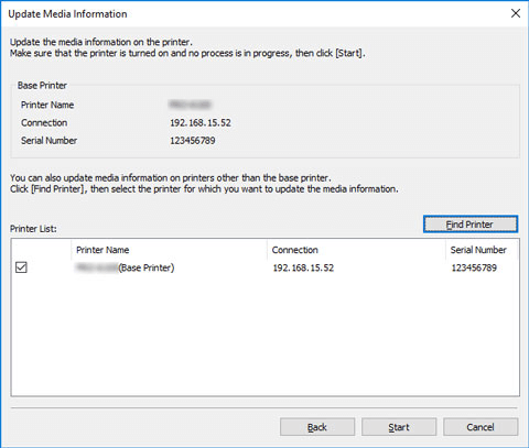 Clique no botão Localizar impressora (Find Printer) para exibir outras impressoras que não a impressora base. Se houver outras impressoras das quais deseja atualizar as informações de mídia ao mesmo tempo que a impressora básica, marque esta caixa de seleção.