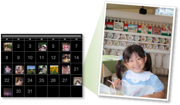 To vam bo olajšalo razvrščanje ali brskanje po fotografijah v prikazu Koledar (Calendar) glede na dogodek. Dogodke lahko enostavno registrirate med preverjanjem slik, prikazanih v koledarju. Ko so registrirane informacije o dogodku, se glede na kategorijo prikažejo tudi različni elementi, v katerih so uporabljene slike, zajete v obdobju dogodka.