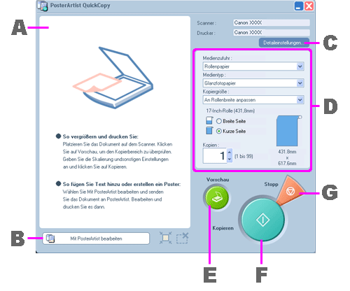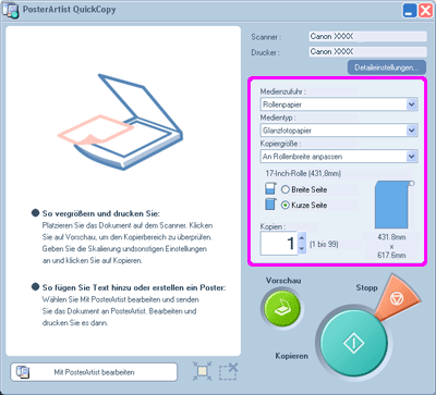 Klicken Sie in PosterArtist QuickCopy einfach auf Kopieren, um das Original zu scannen und eine vergrößerte Version zu drucken. Sie können das Original aber auch prescannen, den Druckbereich prüfen und die Einstellungen nach Bedarf ändern, bevor Sie das Original dann tatsächlich drucken.
