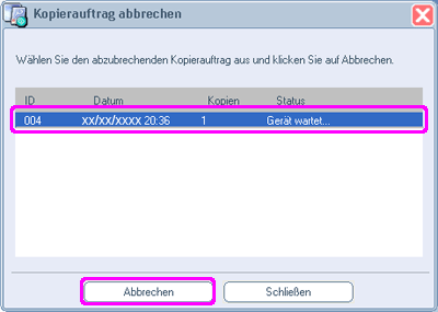 2) Wählen Sie den Auftrag, und klicken Sie auf Abbrechen.