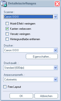 Falls Sie einen anderen Drucker oder Scanner verwenden oder angeben möchten, ob das gescannte Bild korrigiert werden soll, nehmen Sie vor dem Scannen die entsprechenden Änderungen der Einstellungen vor. Weitere Informationen finden Sie unter "Erweiterte Einstellungen in PosterArtist QuickCopy".