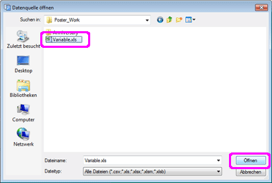 Verwenden Sie für den variablen Druck Excel-Dateien (mit der Dateierweiterung ".xls", ".xlsx", ".xlsm" oder ".xlsb") oder durch Komma getrennte Dateien (mit der Erweiterung ".csv").