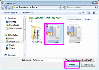 Die durch das Exportieren von Dateien in PosterArtist erstellte Dateien auf einem anderen Computer können in PosterArtist auf Ihren Computer importiert werden. Importierte Dateien werden in der zum Zeitpunkt des Exports angegebenen Kategorie registriert und können genau wie andere Grafiken verwendet werden.