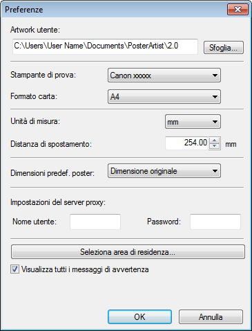 Se si deseleziona la casella di controllo, i messaggi di avvertenza visualizzati durante l'uso di PosterArtist scompaiono.