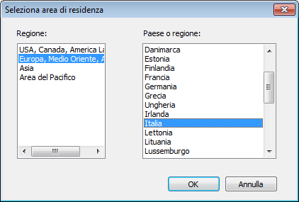 Viene visualizzata la finestra Seleziona area di residenza ed è possibile specificare Regione e Paese o regione.