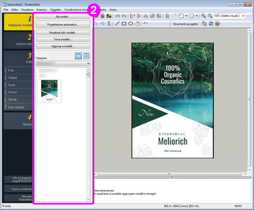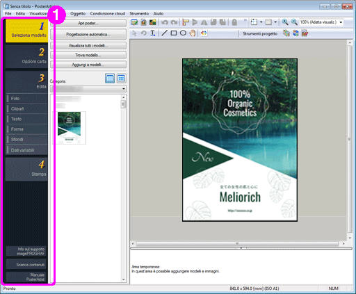 Per creare poster, selezionare le attività dal pannello impostazioni e creare il poster scegliendo modelli, immagini e funzioni. Nella parte inferiore della schermata sono disponibili pulsanti di supporto, ad esempio il pulsante che consente di aprire la presente Guida.