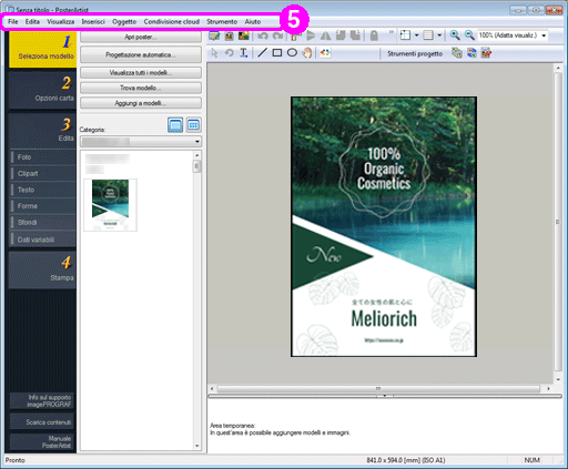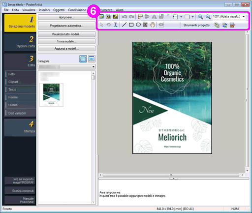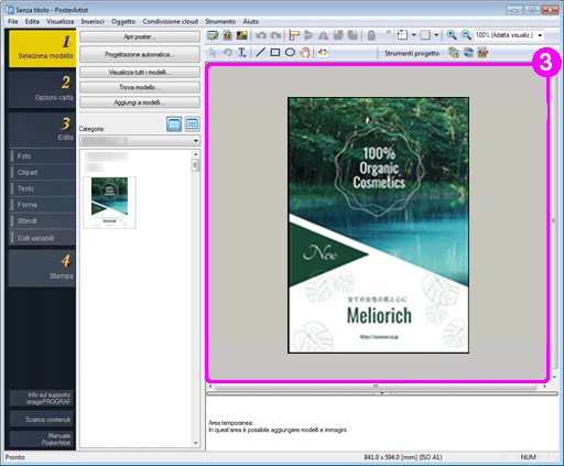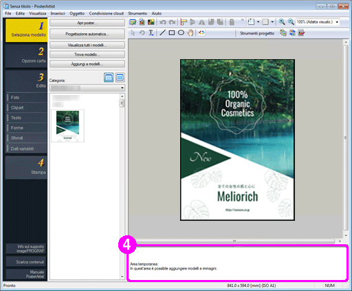 Nell'area temporanea è possibile posizionare le immagini che non si è sicuri di voler utilizzare o quelle utilizzate con maggior frequenza. I modelli e le immagini presenti nell'area temporanea possono essere aggiunti ai poster senza doverli cercare di nuovo tra le miniature.