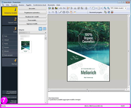 Si tratta dell'area in cui è possibile disporre il testo, le immagini e gli altri oggetti per creare i poster. In questa area è possibile progettare i poster da stampare. È inoltre possibile visualizzare la guida, la griglia e il righello.