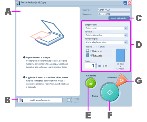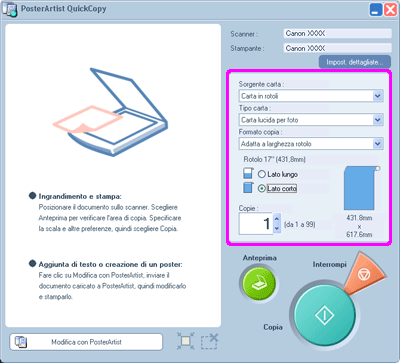 In PosterArtist QuickCopy è sufficiente fare clic su Copia per acquisire l'originale e stampare una versione ingrandita. Se si preferisce, è possibile eseguire una pre-scansione dell'originale, controllare l'area da stampare e modificare le impostazioni secondo necessità prima di stampare l'originale.