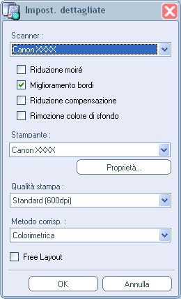Se si prevede di utilizzare una stampante o uno scanner diverso o di specificare se correggere o meno l'immagine acquisita, completare le impostazioni seguenti prima della scansione. Per ulteriori informazioni, vedere "Impostazioni avanzate di PosterArtist QuickCopy."