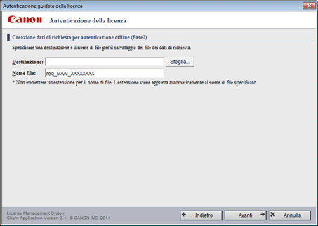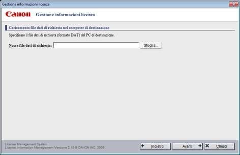 1. Dal menu Start di Windows, selezionare Tutti i programmi > Canon LMS > Gestione delle informazioni sulla licenza per aprire la schermata Gestione delle informazioni sulla licenza, quindi fare clic sul pulsante Trasferisci per aprire la schermata come mostrato di seguito. Specificare il file di dati della richiesta del computer di destinazione e fare clic sul pulsante Avanti.