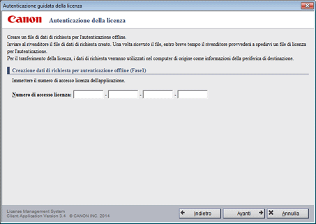 Prima del trasferimento della licenza, installare PosterArtist sul computer di destinazione, lanciarlo e quindi creare il file di dati della richiesta nella schermata di autenticazione della licenza. Per istruzioni sulla creazione del file di dati della richiesta, vedere "Creazione dei dati della richiesta".
