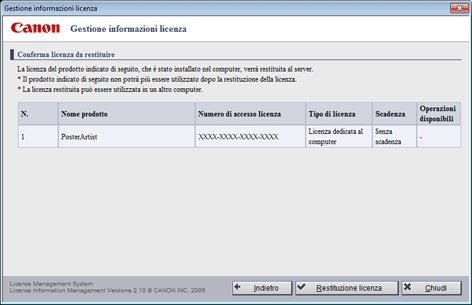 1. Nella schermata Gestione delle informazioni sulla licenza, fare clic sul pulsante Restituzione per aprire la schermata come mostrato di seguito. Controllare la schermata e fare clic sul pulsante Restituzione licenza.