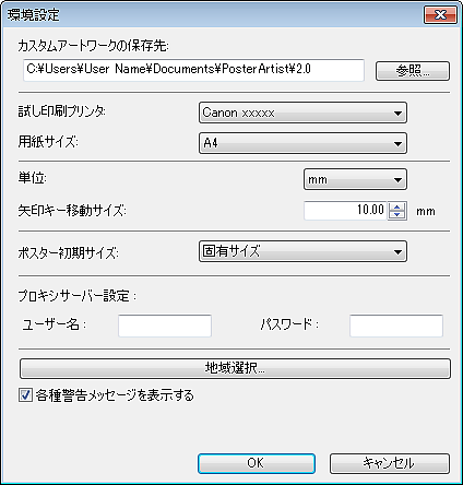 チェックボックスをオフにすると、PosterArtist使用時に表示される各種警告メッセージが表示されなくなります。