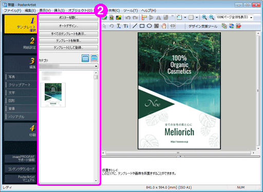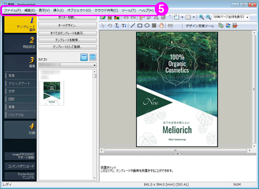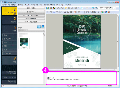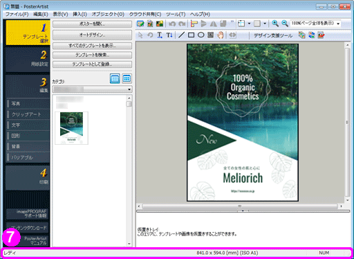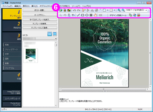 ポスターデザインエリアに表示されているポスターの原稿サイズを表示します。