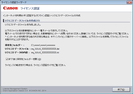 3. 以下のような画面が表示されます。内容を確認して、[終了]ボタンをクリックします。
