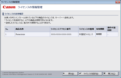 ここでは、お使いのコンピュータにインストールされているPosterArtistのライセンスをサーバに返却する操作方法を説明します。