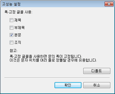 11. [제목], [부제목], [본문], [조직] 중에서 텍스트의 폭을 정렬하고자 하는 것에 체크를 한 후, [확인]을 클릭합니다.