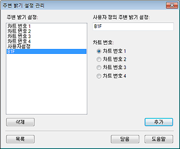 주변 밝기 설정은 임의의 이름을 지정하여 등록할 수 있습니다. 또한 등록한 주변 밝기 설정을 삭제하거나 목록으로 표시할 수도 있습니다. 자주 사용하는 주변 밝기 설정을 등록해 놓으면 게시할 환경에 맞는 포스터를 바로 인쇄할 수 있습니다.