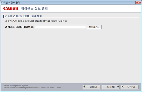 1. 시작 메뉴에서 [모든 프로그램]→[Canon LMS]→[라이센스 정보 관리]를 차례대로 선택합니다. 그런 다음 [라이센스 정보 관리] 화면에서 [전송] 단추를 클릭하면 다음과 같은 화면이 표시됩니다. 라이센스를 전송할 컴퓨터의 리퀘스트 데이터 파일을 지정하고 [다음] 단추를 클릭합니다.