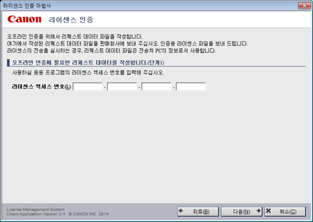 1. [라이센스 인증] 화면에서 [오프라인 인증]과 [리퀘스트 데이터 작성]을 선택하고 [다음] 단추를 클릭하면 다음과 같은 화면이 표시됩니다. 사용 중인 PosterArtist의 라이센스 접속 번호를 입력하고 [다음] 단추를 클릭합니다.