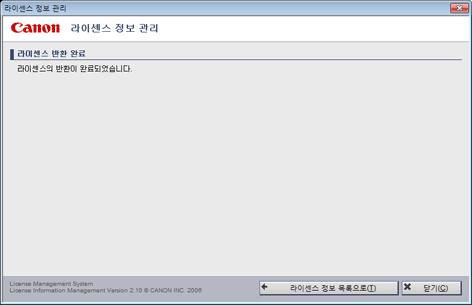 1. [라이센스 정보 관리] 화면에서 [반환] 단추를 클릭하면 다음과 같은 화면이 표시됩니다. 내용을 확인하고 [라이센스 반환] 단추를 클릭합니다.