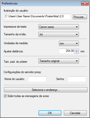 A caixa de diálogo Preferências permite que você altere o local para salvar sua ilustração original para uso no PosterArtist e a impressora para impressão de teste e tamanho da mídia. Além disso, altera a unidade de comprimento, quanto o cursor se move quando a tecla de seta for pressionada e o tamanho padrão dos modelos da biblioteca.